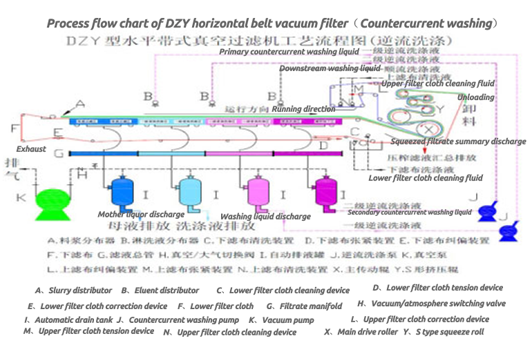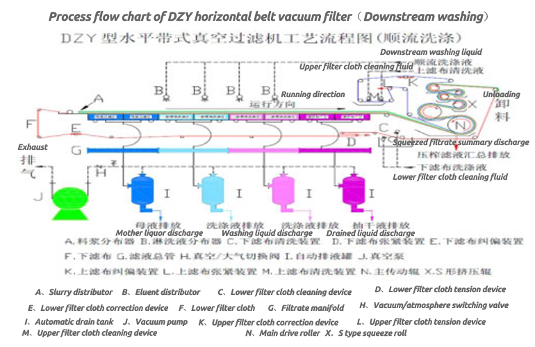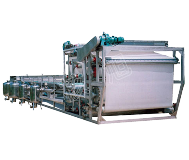 At the beginning of the filter stroke of the DZY belt press vacuum filter, the filter disc runs synchronously with the filter belt in a vacuum state, and the material is evenly distributed on the filter belt of the vacuum filter disc through the slurry distributor, and is carried out under the action of vacuum suction. Suction filtration. Subsequently, the semi-dry filter cake continues to run under the drag of the filter cloth and enters the press roll for squeezing to fully reduce the moisture content of the filter cake. The filter cake after filtering, washing and squeezing is stripped and removed by the scraper device. After the filter cloth is cleaned by the regeneration device, it enters the next cycle again. The filtrate from the collecting tank is discharged at the same time as the filter pan returns, and the filtrate in the squeeze roller flows into the collecting pan. Through such repeated suction filtration, washing, re-suction filtration, and extrusion, the purpose of solid-liquid separation is realized.