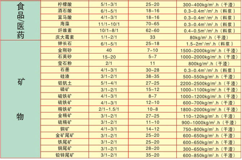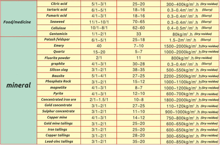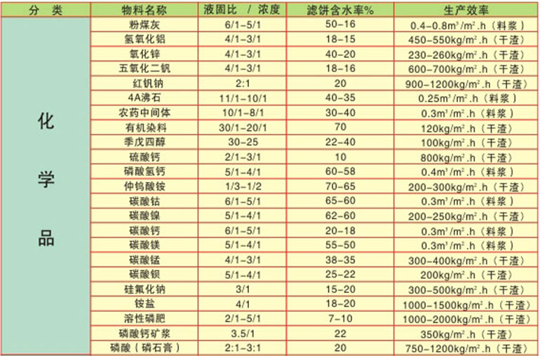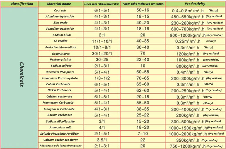 Table of typical application examples of DU rubber belt vacuum filter: