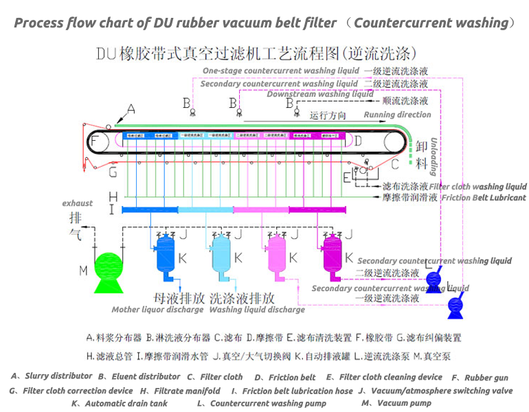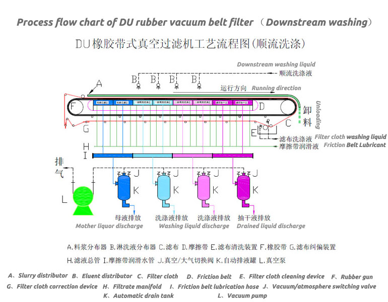 The rubber belt vacuum filter is a high-efficiency separation equipment that uses filter cloth as the filter medium, makes full use of the gravity of the material, and relies on vacuum negative pressure as the power to achieve solid-liquid separation; the equipment is structured, and the filtering section is arranged along the horizontal length direction; A fixed vacuum box is used. The filtration, cake washing, slag unloading, and filter cloth cleaning of the equipment in the production process are continuously completed with the operation of the tape; the equipment can adapt to materials of different concentrations, and the mother liquor and filter cake washing liquid can be collected in stages, with high production capacity and filtration High efficiency, good washing effect, low moisture content of filter cake and other advantages. At the same time, the belt speed, feed volume, slurry concentration, washing water volume, vacuum degree, washing zone and drying zone can all be selected ideal parameters according to production needs. The equipment has few vulnerable parts and low failure rate, which can realize long-period continuous operation, stable operation, simple operation and low labor intensity. After years of improvement and perfection, the rubber belt vacuum filter has reached the international advanced level in technology and is widely used in electric power environmental protection, mining, chemical, metallurgy, papermaking, food, pharmaceutical and coal industries.
